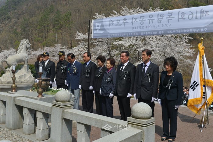 경기 동두천시 독립유공자 추모회에서는 9일 소요산 독립유공자 추모비에서 '제16회 독립유공자 추모제'를 거행했다. 추모제는 조국의 독립을 위해 헌신한 순국선열의 숭고한 희생정신과 나라사랑의 참뜻을 기리고 자라나는 학생들에게 나라사랑의 마음을 갖게 하기 위해 매년 4월 둘째주 수요일에 열린다. (사진제공=동두천시청)