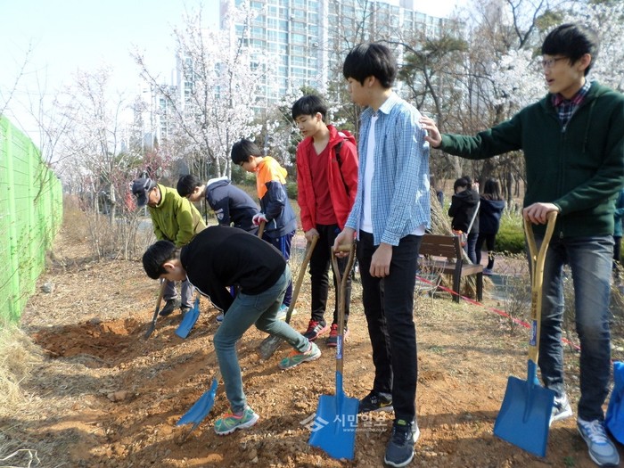 경기 고양시 일산서구 탄현동 주민자치위원회은 지난 5일 식목일을 맞이해 탄현역 부근 산책로에 무궁화나무를 식재하는 행사를 열었다. 이번 행사에 주민자치위원회, 통장협의회, 적십자 봉사단 등 탄현동 직능단체원 20여명과 지역내 학생 80여명, 총 100여명에 달하는 인원이 참여해 뜨거운 관심을 보였다. 사진은 참가자들이 무궁화나무를 식재하고 있는 모습.(사진제공=고양시청)