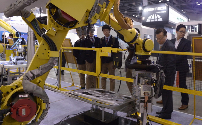 9일 오후 경기도 고양시 일산 킨텍스에서 열린 서울국제공작기계전(SIMTOS 2014)에서 관람객들이 기업들의 생산제조기술을 살펴보고 있다. 산업통상자원부가 주최하고 한국공작기계산업협회가 주관하는 국내 최대 규모의 이번 전시회는 전세계 33개국 850개사가 참여할 예정이며 오는 13일까지 개최된다.