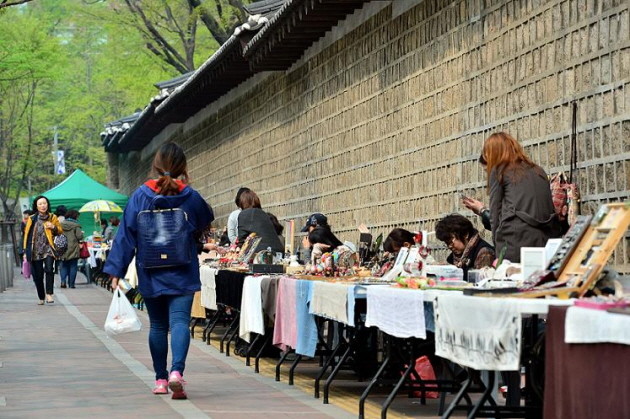 13일 오전 서울 중구 덕수궁 돌담길에서 열린 돌예공(덕수궁 돌담길 예술시장 공동체)에서 시민들이 다양한 핸드메이드 악세사리들과 공예품들을 살펴보고 있다.