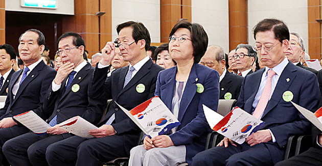 13일 오전 서울 용산구 효창동 백범김구기념관에서 열린 제95주년 대한민국임시정부수립 기념식에서 박원순 서울시장과 서울시장 예비후보들을 비롯한 참석자들이 어색한 표정을 짓고 있다. 오른쪽부터 김황식, 이혜훈, 정몽준 새누리당 서울시장 예비후보, 박 시장, 박승춘 국가보훈처장.