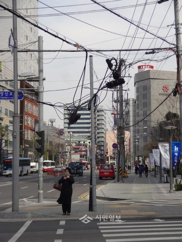 [시민일보=박기성 기자]유동인구가 많은 영등포 타임스퀘어에서 불과 5분 떨어진 횡단보도에 불량 공중선이 방치돼 인근 주민들이 불편함을 겪고 있다.