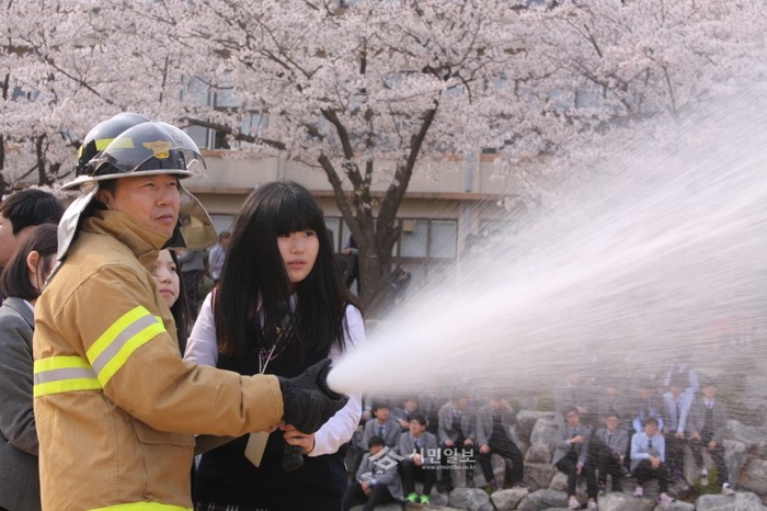 최근 인천 강화소방서는 강화군 길상면 소재 강남영상미디어고등학교 학생 230여명을 대상으로 소방공무원에 대한 이해도 증진과 직업관 정립에 도움을 주기 위해 직업체험 프로그램을 운영했다. 사진은 소방차량을 이용한 방화체험을 하고 있는 소방대원과 학생의 모습. (사진제공=강화소방서)