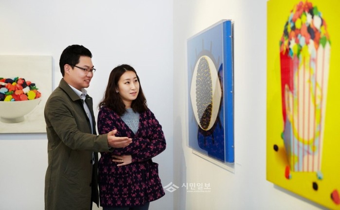 | ▲ 송도 더샵 마스터뷰 모델하우스에서 진행하는 '나는 상상한다. 고로 존재한다 - 팝아티스트 호진 상상 展 '을 관람하는 모습. | ||