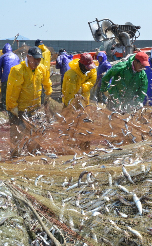 지난 14일 오후 경남 남해군 미조항에서 남해군 선적 7.93톤 삼양호 선원들이 갓 잡아 올린 멸치를 그물에서 털어내고 있다.