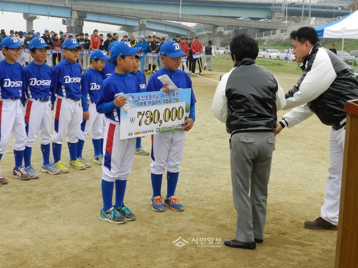최근 경북 구미시 강변 1구장에서 이마트 구미점이 시민들로부터 모인 성금 73만원을 도산초 야구부 선수 육성기금으로 전달했다. 사진은 이날 전달식에 참여한 야구부원들이 적립금을 전달받고 있는 모습. (사진제공=구미교육지원청)