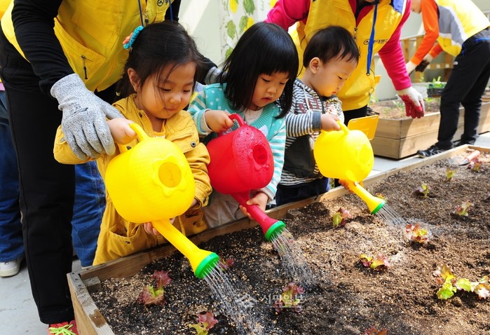 지난 14일 서울 동대문구 구청 옥상 자연학습체험장에서 열린 '소통과 나눔이 있는 모종심기 행사'에서 관계자들과 지역주민·어린이집 원생 등이 딸기, 상추, 오이 등의 모종심기 체험을 가졌다. 사진은 이날 옥상텃밭에 식재한 모종에 물을 주고 있는 아동들의 모습.(사진제공=동대문구청)
