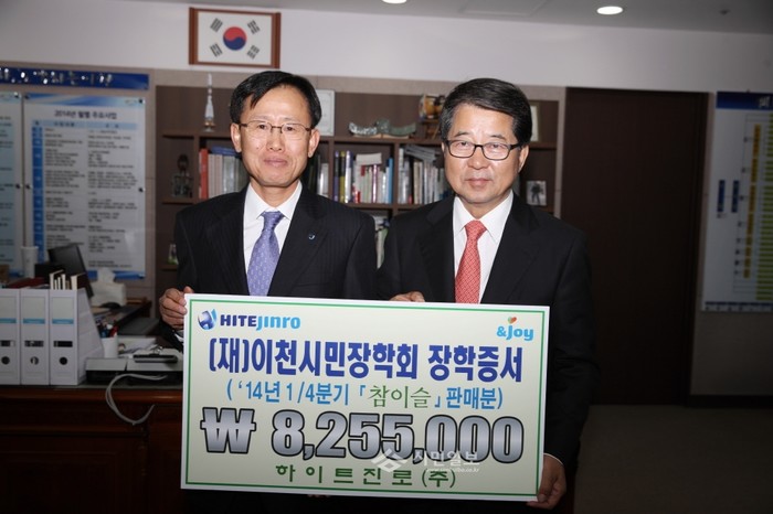 16일 경기 이천시가 (주)하이트진로 이천공장으로부터 이천시 지역에서 판매된 참이슬 1병당 5원씩을 적립한 장학기금 825만원을 기탁받았다. (주)하이트진로는 1998년부터 현재까지 이천시민장학회에 총 6억7500여만원의 장학금을 기탁했다. 사진은 기탁식에 참여한 강근구 공장장(왼쪽)과 조병돈 시장(오른쪽)의 모습. (사진제공=이천시청)