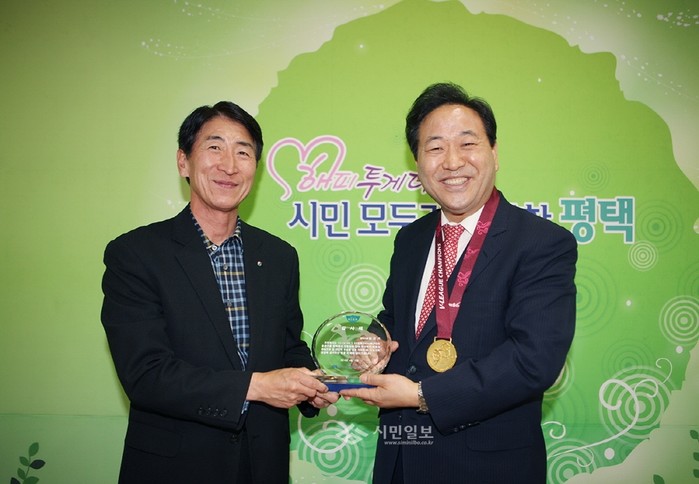 17일 GS 칼텍스 Kixx 배구단은 '2013-2014 V-리그 챔피언 결정전'에서 우승을 차지할 수 있던 원동력이 꾸준히 경기장을 찾아 팀을 응원해준 평택시민들 덕분이라며 김선기 평택시장에게 감사패를 전달했다. 사진은 이날 전달식에 참여한 김선기 시장(오른쪽)과 장기주 구단주 대행(왼쪽)의 모습. (사진제공=평택시청)