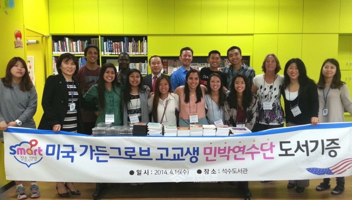 지난 16일 경기 안양시 석수도서관은 미국 가든그로브시 고등학생 민박연수단으로부터 안양시에 거주하는 다문화가정이 한국 사회에 안정적으로 정착하길 응원하는 메시지를 담은 도서·영화 DVD 등 자료 115점을 기증받았다. 사진은 이날 자료를 기증한 연수단의 모습. (사진제공=안양시청)