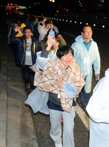 '세월호' 침몰사고 실종자 가족들이 20일 새벽 진도 실내체육관 인근 도로에서 구호를 외치며 청와대로 향하고 있다. 실종자 가족들은 "김석균 해양경찰청장이 '내 선에서는 더 이상 못하겠다'고 손을 들었다"며 "구조 작업을 총괄하는 정부 종합상황실의 책임자는 전화 연결조차 안 된다"고 하소연했다. 이어 "우리가 할 수 있는 것은 이제 하나밖에 없다. 청와대로 가 대통령에게 우리의 절박한 사정을 보여줘야 한다. 서울시민에게도 알려야 한다"며 서울로 향했다.