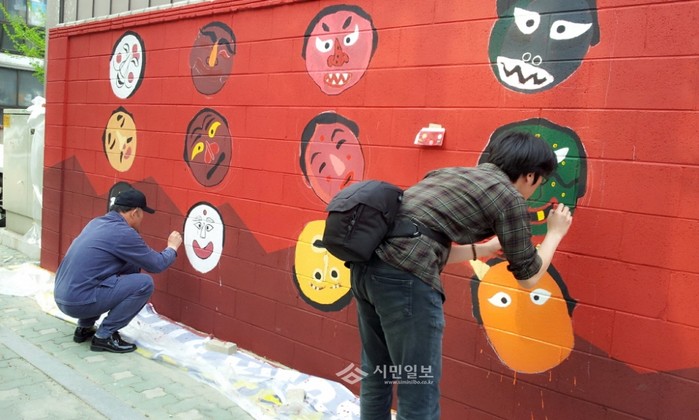 최근 서울 마포구 합정동에서 (주)엔비스타 직원봉사단, 합정동 주민자치위원회, 상가번영위원회 회원 등 총 50여명이 참여해 마포구 월드컵로3길 75, 76을 방문하는 외국인 관광객들에게 한국의 문화를 알리기 위한 벽화를 그렸다. 사진은 벽화 작업 중인 봉사자의 모습. (사진제공=마포구청)