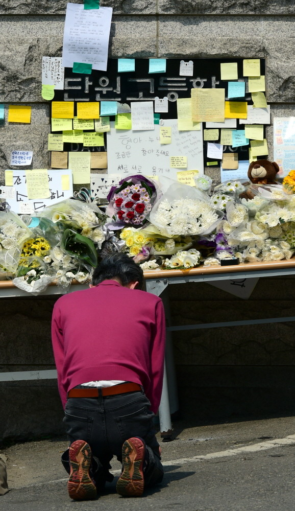 세월호 침몰 6일째인 21일 오전 경기 안산 단원고 정문에서 한 시민이 큰절을 하고 있다.