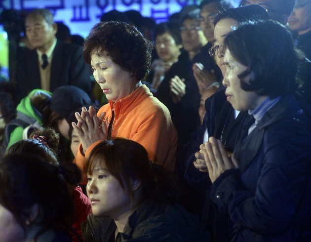 '세월호' 여객선 침몰사고 발생 닷새째인 20일 오후 전남 진도실내체육관 앞 광주대교구 임시 기도천막에서 여객선 침몰 사고 사망자와 실종자들을 위해 미사가 열리고 있다.
