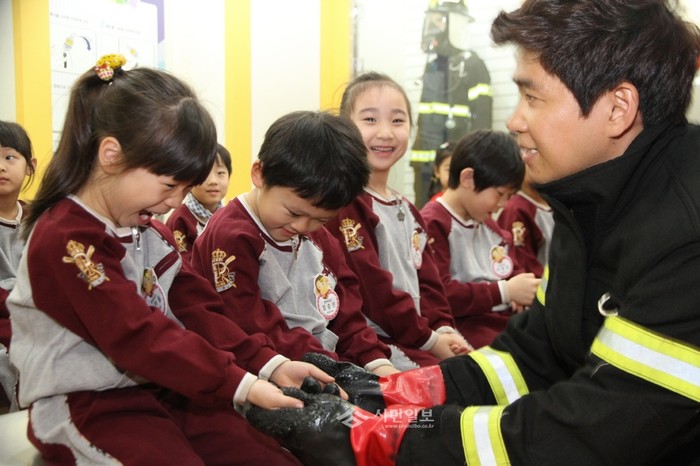 서울 구로소방서는 22일 예일유치원 원생 및 지도교사 등을 대상으로 어린이들의 자기 보호능력 향상은 물론 안전을 생활화하는 풍토를 조성해 유사시 재난대처능력을 향상시키기 위한 1일 병아리 소방관 체험학습을 운영했다. 사진은 소방장비체험을 하고 있는 어린이들의 모습. (사진제공=구로소방서)