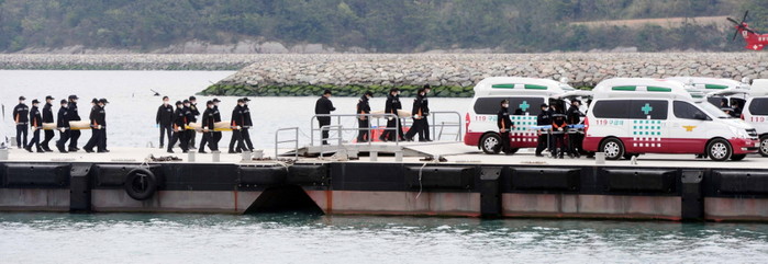'세월호' 여객선 침몰 사고 발생 7일째인 22일, 전남 진도군 팽목항으로 희생자 시신이 운구되고 있다.