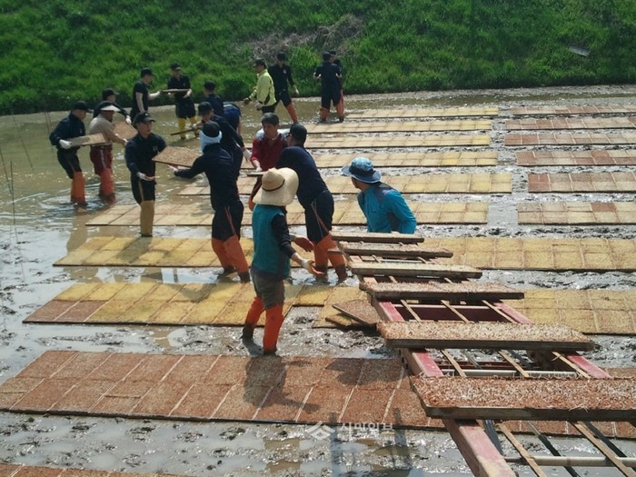 지난 21일부터 경기 평택시 포승읍의 해군 제2함대가 장병 300여명을 투입해 봄철을 맞아 많은 일손을 필요로 하는 농촌지역에서 못자리 만들기, 고추심기 등의 일을 돕는 '봄철 영농기 농촌 일손돕기'를 추진 중이다. 사진은 일손돕기 활동에 참여한 장병들이 못자리 만들기 작업을 하는 모습. (사진제공=평택시청)