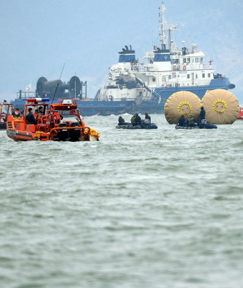 ‘세월호’ 여객선 침몰 사고 발생 7일째인 22일 오후 전남 진도군 조도면 병풍도 북쪽 3km 인근 해상에서 해경과 민간 잠수사 등 관계자들이 실종자 수색 및 구조작업을 진행하고 있다.