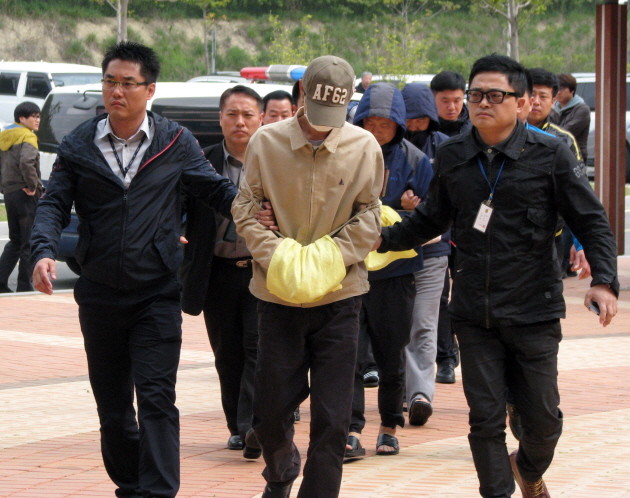 전남 진도 해상에서 침몰한 세월호 기관장 박모(54)씨 등 4명이 22일 오전 영장실질심사를 받기 위해 광주지법 목포지원으로 들어가고 있다.