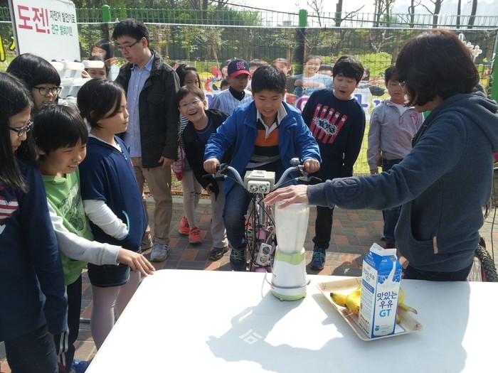 지난 21일 서울 강동구가 제44회 지구의날과 제6회 기후변화주간을 맞이해 지역 주민들을 대상으로 기후변화와 저탄소 녹색생활의 중요성을 홍보하기 위해 운영 중인 친환경바이오에너지 체험농장에서 어린이들이 자전거 페달을 밟아 전기를 만들어 믹서기를 작동시키는 체험을 해보고 있다. (사진제공=강동구청)
