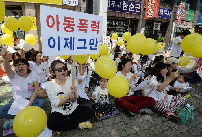 '하늘로 소풍 간 아이를 위한 모임' 회원들이 23일 오전 대구지방검찰청 앞에서 집회를 열고 칠곡 의붓딸 학대 치사 사건의 계모에게 살인 혐의를 적용할 것을 촉구하고 있다.