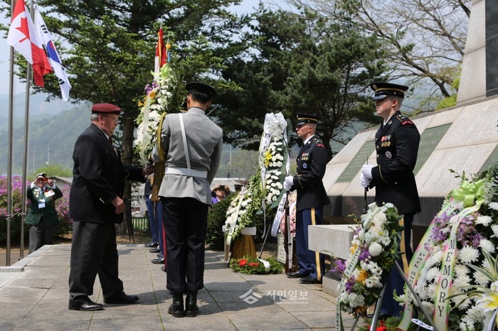 경기 가평군에서 24일 6.25전쟁당시 고국을 떠나와 목숨을 걸고 싸워준 영국, 캐나다, 호주, 뉴질랜드 등 영연방 참전국가 용사들에 대한 추모와 감사의 마음을 기리기 위한 '영연방 한국전 참전 63주년기념행사'가 가평읍 영연방 참전비에서 거행됐다. 사진은 캐나다 참전용사가 헌화하고 있는 모습. (사진제공=가평군청)