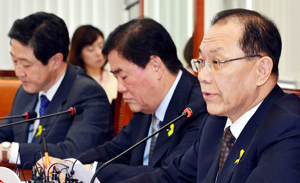 24일 오전 서울 여의도 국회 새누리당 대표실에서 열린 최고위원회의에서 황우여 대표가 임시분향소 관련 이야기하고 있다.