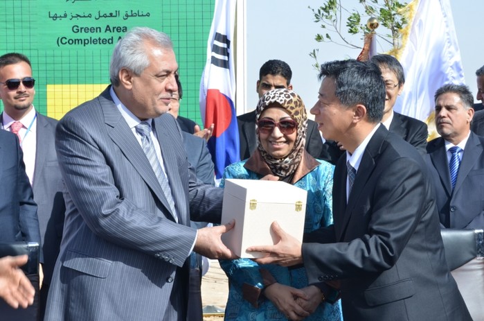 | ▲지난 2월 22일 이라크 카르발라 현장에서 열린 카르발라 프로젝트 계약식에서 임병용 GS건설 사장(오른쪽)과 압둘 카림 이라크 석유부 장관(왼쪽)이 계약 서명식 후 선물을 나누고 있다. (GS건설 제공) | ||