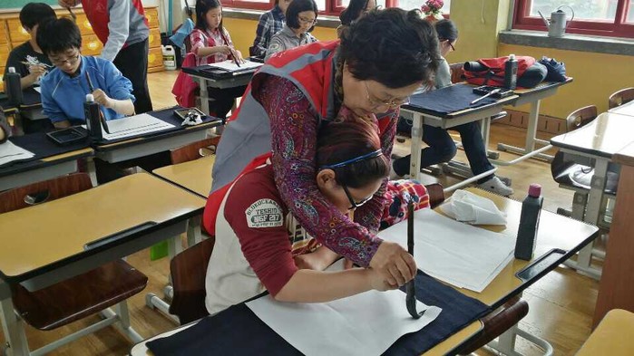 서예수업은 서예의 의미와 함께 차분히 앉아 글을 쓰는 서예 활동을 통해 아이들이 끈기와 인내, 그리고 정서적 안정을 배워가는 시간으로 노인들은 아이들이 쉽게 서예와 친해질 수 있도록 돕는다.