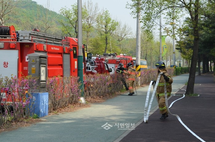 인천 남동소방서는 지난 25일 지역내에 위치한 소래산에서 소방차량 10여대, 소방대원 60여명을 동원한 '긴급구조통제단 가동훈련'을 실시했다. 이날 훈련에는 실제 산불이 나 확대된 상황을 가정해 실시했다. 사진은 소래산에서 진행한 긴급구조통제단 가동훈련 모습. (사진제공=남동소방서)