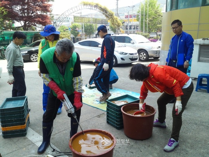 경북 구미 형곡2동은 지난 24일 새마을남여지도자협의회 회원 및 지역공동체 일자리 사업 참여자 등 20여명이 참여한 가운데 폐식용유를 이용한 재활용 비누 만들기를 실시했다. 사진은 비누 만들기 참가자들이 폐식용유를 이용해 비누를 만들고 있는 모습. (사진제공=구미시청)