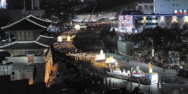 부처님오신날을 열흘 앞둔 26일 오후 서울 종로구 흥인지문(동대문)앞으로 불자들이 세월호 실종자 무사 귀환과 극락왕생을 기원하는 연등행렬을 하고 있다.