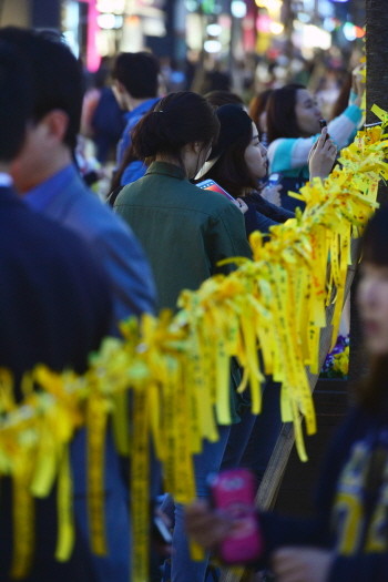 26일 오후 서울 서대문구 연세로에서 열린 세월호 참사 실종자 생환을 바라는 '하나의 작은 움직이 큰 기적을'에 참가한 시민들이 노란 리본을 달며 세월호 실종자 무사 귀환 및 희생자 추모를 하고 있다.