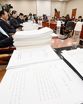 28일 오전 국회 법제사법위원회 전체회의가 열린 서울 여의도 국회 법사위 회의실 의원석에 법안들이 쌓여 있다.