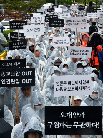 28일 오후 서울 여의도 한국방송(KBS) 앞에서 세월호의 실소유주인 유병언 전 세모그룹 회장에 대한 비리 의혹 제기와 관련해 기독교복음침례회(일명 구원파) 신도들이 정부와 언론의 공정성을 요구하는 집회를 하고 있다.