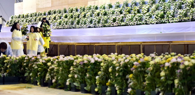 세월호 침몰 13일째인 28일 오후 경기 안산 화랑유원지에 세월호 희생자 합동분향소가 준비되고 있다. 공식 합동분향소는 29일 오전 10시부터 조문객을 맞을 예정이다.
