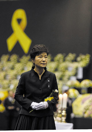 박근혜 대통령이 29일 오전 경기 안산 단원구 화량유원지에 마련된 ‘세월호 사고 희생자 정부 합동분향소’를 찾아 조문하고 있다.