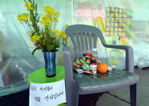 ‘세월호’ 여객선 침몰 사고 발생 14일 째인 29일 오전 전남 진도군 팽목항 희망메세지 보드판 앞에 아이들이 좋아하는 간식거리와 유채꽃 화분이 놓여 있다.