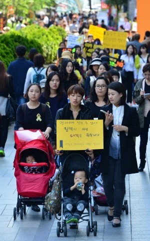 30일 오후 서울 강남역 일대 거리에서 마담방배, 서초엄마들의모임, 자연출산카페 회원들이 유모차를 끌고 세월호 참사 희생자 추모 및 안전한 사회를 촉구하는 '엄마라서 말할 수 있다' 행진을 하고 있다.