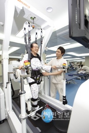 | ▲ 재활병동에서 환자가 재활치료로봇을 이용해 대뇌신경의 가소성을 증진시키는 하지운동을 하고있는 모습. (사진제공=강남구립 행복요양병원) | ||