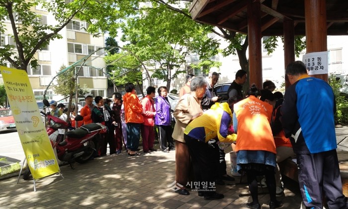 지난 4월29일 충남 아산시 온양6동 행복키움추진단이 대한적십자사 온양6동 봉사회와 함께 복지서비스의 일환으로 지역내 저소득가구에 백미, 라면, 양말 등의 후원물품을 전달했다. 사진은 이날 봉사자들이 물품을 저소득층 주민들에게 나눠주는 모습. (사진제공=아산시청)