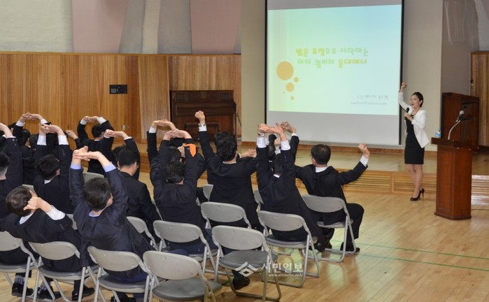 지난 4월29일 서울 강남소방서가 서 5층 강당에서 '2014년 소방 청렴도 향상 대책 및 서울시 소통역량 강화'를 위해 CS 전문강사를 통한 친절 교육을 실시했다. 사진은 이날 교육에 참가한 민원업무 담당 직원들이 감성 커뮤니케이션에 대한 교육을 받는 모습. (사진제공=강남소방서)