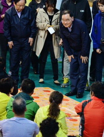 정홍원 국무총리가 세월호 여객선 침몰 사고 16일째인 1일 오전 전남 진도 체육관을 방문해 실종자 가족과 이야기를 나누고 있다.