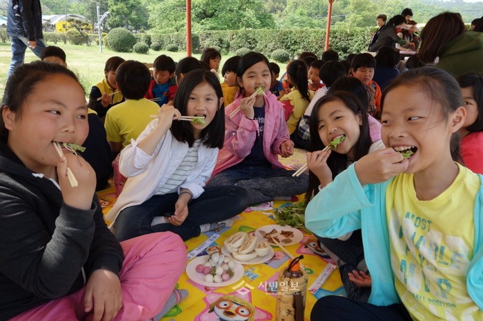 지난 2일 도곡중앙초등학교는 초등학교 잔디밭에서 어린이날을 맞이해 교사를 비롯한 전교직원이 참여한 가운데 학생들을 위한 특별한 밥상을 차렸다. 이날 행사에 참여한 학생들은 텃밭가꾸기를 통해 수확한 채소를 직접 수확하고 씻었고 교사들은 고기를 굽고 상을 장만했다. (사진제공=전남도교육청)