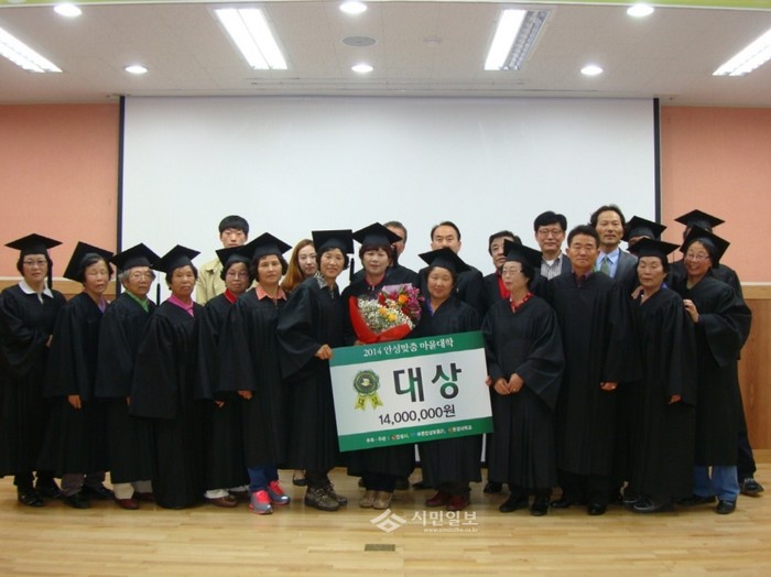 경기 안성시는 '2014년 안성맞춤 마을대학' 수료식을 최근 개최하고 5개 마을 52명에게 수료증을 전달했다. 이날 행사에는 각 마을 대표들이 '마을의 지속가능한 발전계획과 비젼'이라는 주제로 마을 발전방안을 발표했으며 '자연과 사람의 어울림 행복마을 어리실'이라는 제목으로 발표한 일죽면 화곡리 우곡마을이 대상을 수상했다. (사진제공=안성시청)