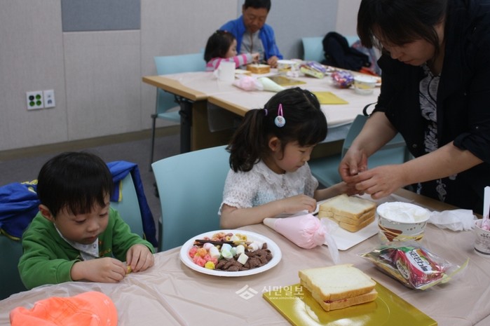 K-water 한강통합물관리센터는 어린이날이 포함된 연휴를 맞아 지난 3일 경기 여주시 한강문화관에서 과자집 만들기 교실을 운영해 과자, 빵 등 여러 재료를 이용하여 어린이들이 가족과 함께 맛있는 과자집을 만드는 시간을 가졌다. 사진은 이날 행사에 참가한 아이들이 과자집을 만드는 모습.(사진제공=K-water)
