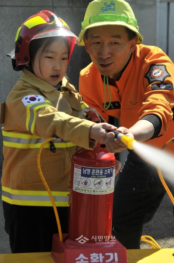 서울 구로소방서는 지난 3일 구로구 고척근린공원에서 고척2동 새마을부녀회 주관으로 진행된 '능골 녹색장터' 바자회 행사와 연계해 '생명을 살리는 사람들 119체험' 부스를 운영해 마네킹을 활용한 심폐소생술 체험실습, 연기·물소화기를 활용한 초기화재 진화체험 등을 실시했다. 사진은 초기화재 진압체험 중인 아이의 모습.(사진제공=구로소방서)