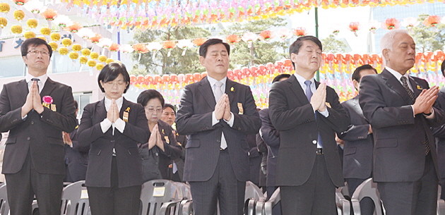 6일 서울 종로구 견지동 조계사에서 열린 불기2558년 부처님오신날 봉축 법요식에 참석자들이 합장하고 있다. 오른쪽부터 김한길·안철수 새정치민주연합 공동대표, 최경환 새누리당 원내대표, 이정희 통합진보당 대표, 천호선 정의당 대표.