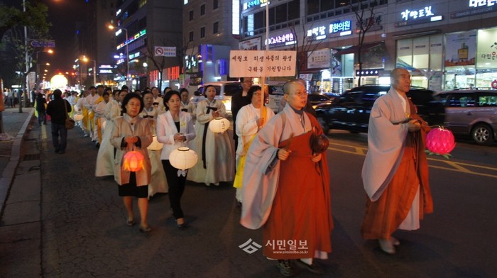 경기 고양시는 지난 2일 덕양구 화정동 중앙공원에서 고양시 불교사암연합회 주관으로 불기 2558년 부처님 오신 날을 기리는 연등제를 봉행했다. 이번 행사는 세월호 참사의 희생자를 위로하고 실종자의 무사 생환을 기원하는 법회로 열어, 함께한 시민들 역시 박수 대신 합장으로 차분한 분위기 속에서 진행했다. 사진은 제등행렬이 진행하는 모습. (사진제공=고양시청)