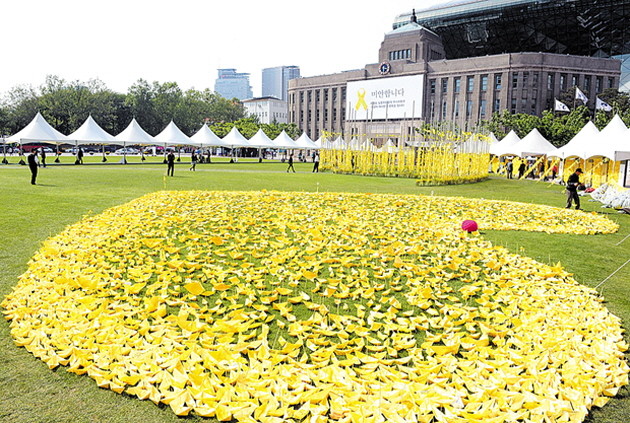 세월호 침몰 22일째인 7일 오후 서울 중구 시청 서울광장에 마련된 희생자 합동분향소 주위에 추모 글귀가 적힌 노란색 종이배가 하트모양으로 놓여있다.란색 종이배가 하트모양으로 놓여있다.